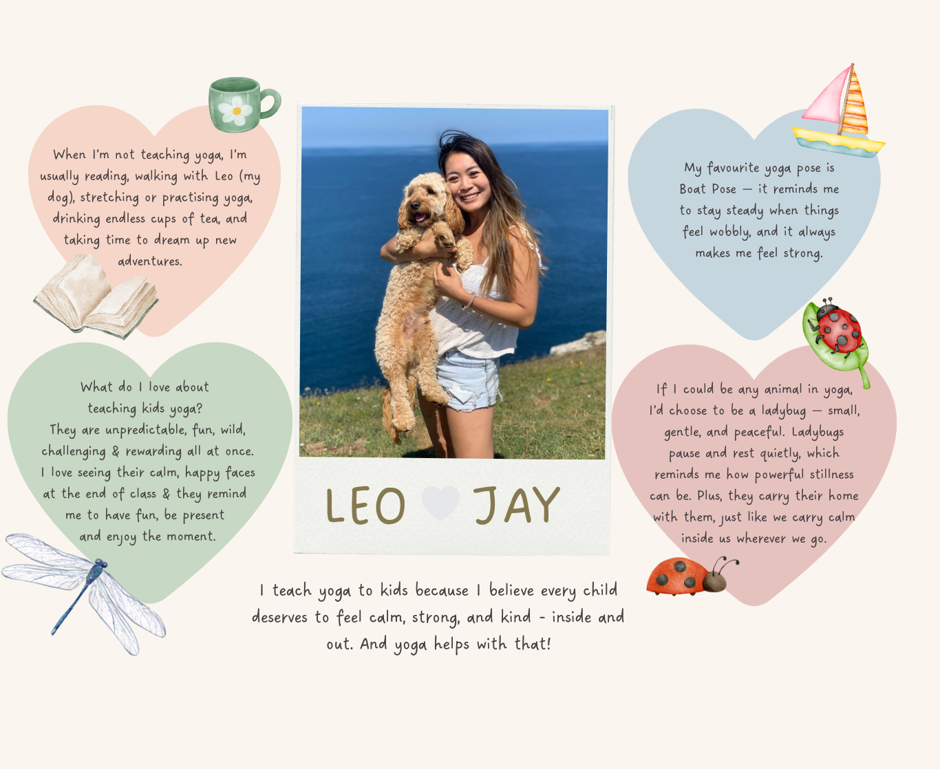 Hi, I’m Jay, a children’s yoga teacher with over 10 years of experience and a deep love for helping little ones (and grown-ups!) feel calm, confident, and connected.